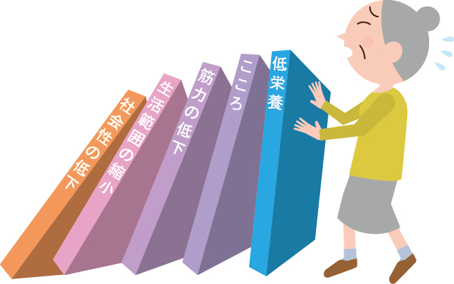 健康→プレフレイル→フレイル→要介護の変化を示したイラスト。自転車から膝痛、杖、車椅子へ