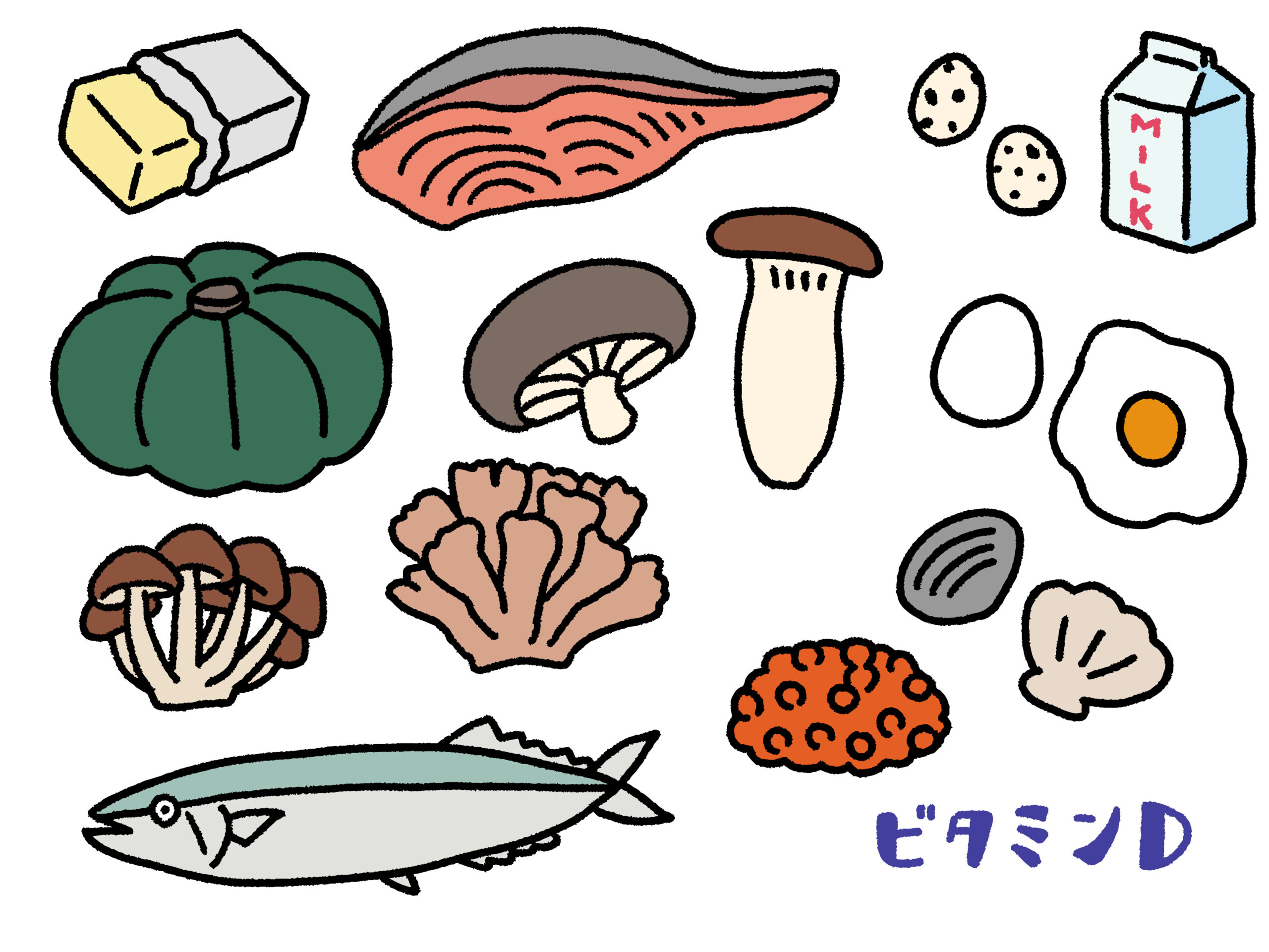 運動で骨に刺激を与えるだけでなく、栄養で内側から支えることも重要です。カルシウムは骨の主成分ですが、ビタミンDが不足すると効率よく骨に届きません。ビタミンDは腸でのカルシウム吸収を高め、血中カルシウム濃度を安定させ、骨の形成と吸収のバランスを整える働きがあります。食事ではサケ、サンマ、イワシ、シイタケなどから摂取でき、日光浴でも体内で生成されます。